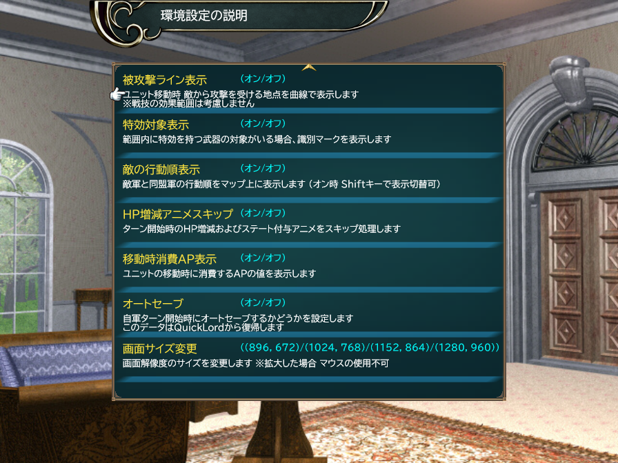 変更できる設定項目が増えてきたので、その説明一覧を別画面で表示するようにしました。