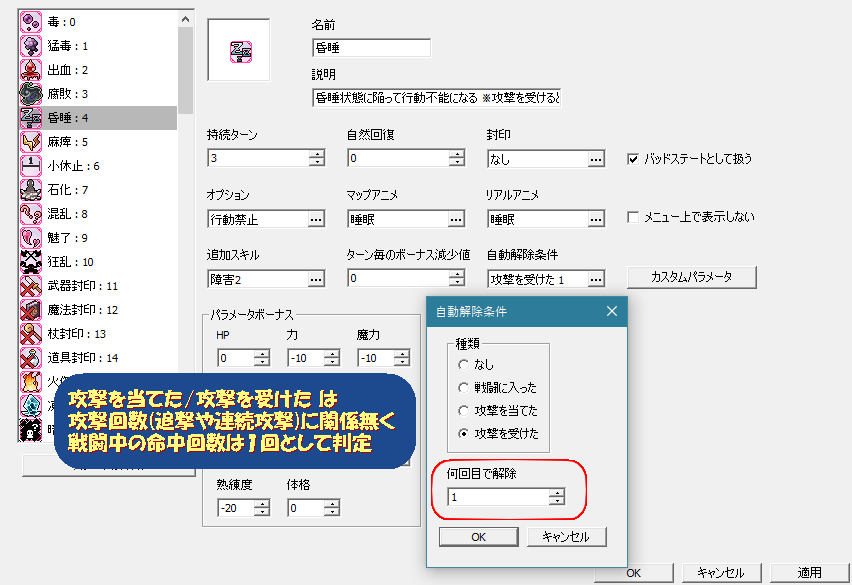 攻撃回数が解除条件に達した戦闘で「睡眠」を付与しても戦闘終了後に解除されてしまう。